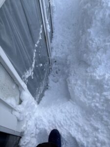 現場に向かうと、窓の外側には腰の高さ近くまで雪が押し寄せ、完全に塞がれた状態でした。